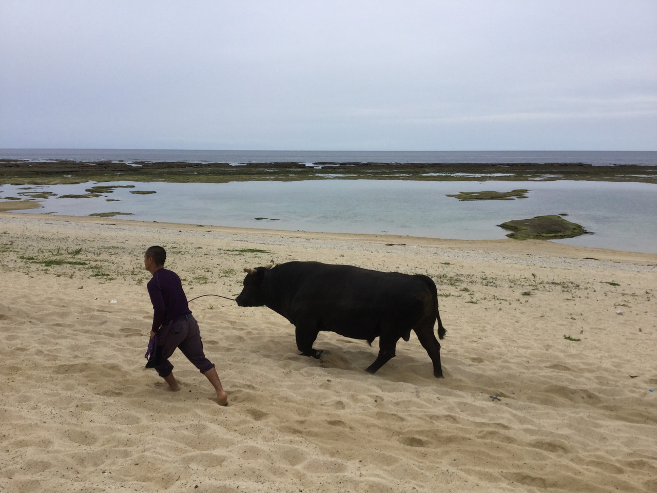 夕方、砂浜で足を鍛えるために牛を散歩させていました。