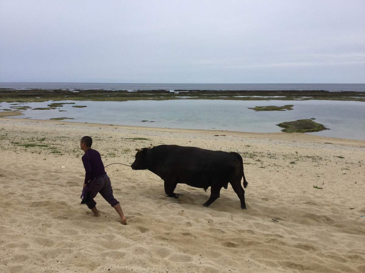 徳之島にはいくつかの闘牛場があり、少年達が闘牛の世話や散歩をしています。