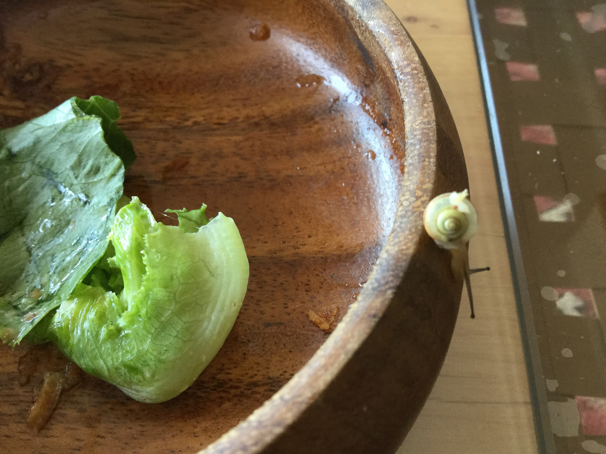 2017年6月10日 朝食のサラダから出て来た美山生まれのかたつむり🐌 畑のサニーレタスにいたかたつむりは、無農薬の賜物です。 一人前に3ミリ位の殻をまとっています。 午後には、庭の紫陽花に戻してあげましょう。。 6月の思わぬ出会いでした。
